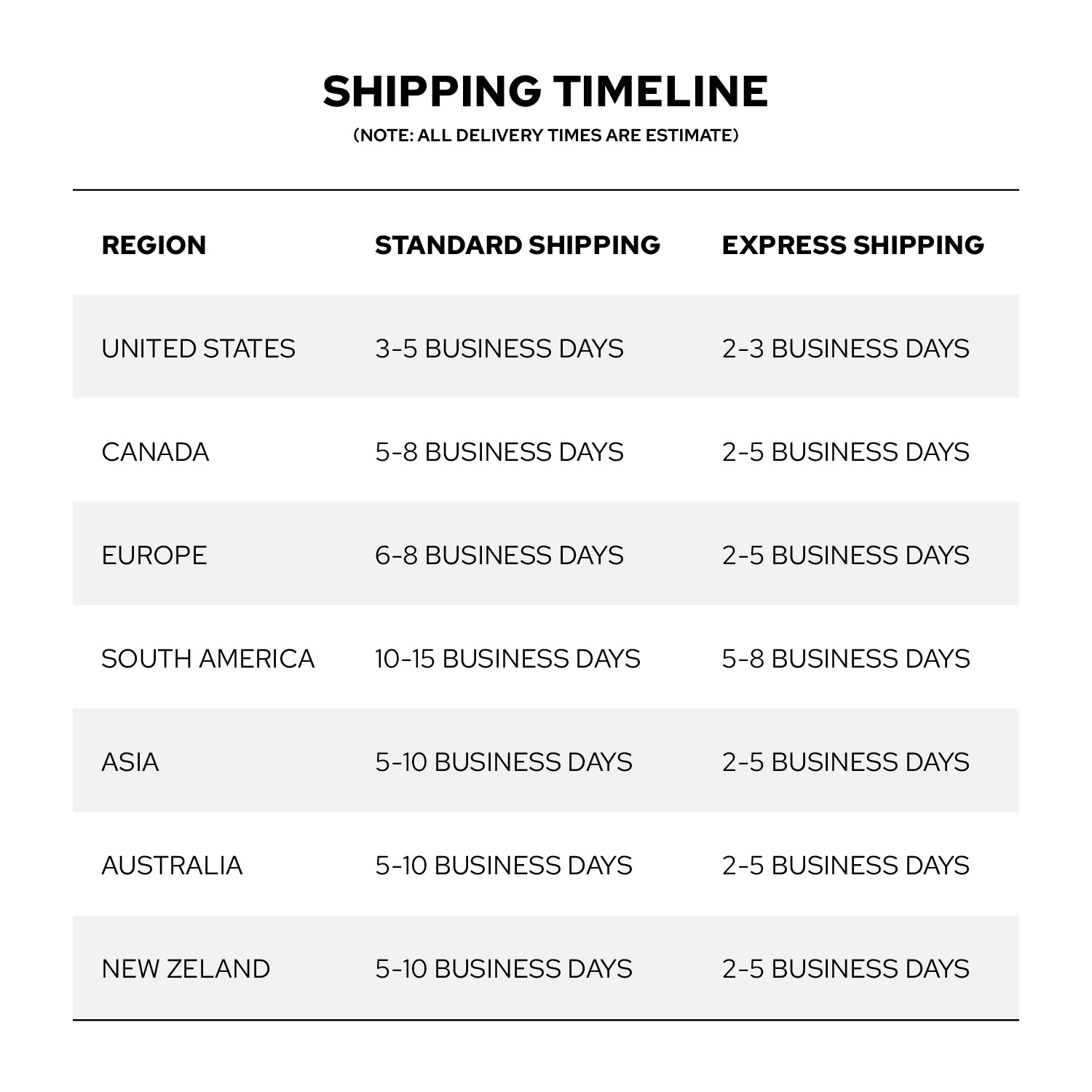 ORDERS ARE PROCESSED WITHIN 1-2 BUSINESS DAYS (EXCLUDING WEEKENDS AND HOLIDAYS). ONCE SHIPPED, YOU’LL RECEIVE A CONFIRMATION EMAIL WITH A TRACKING NUMBER.